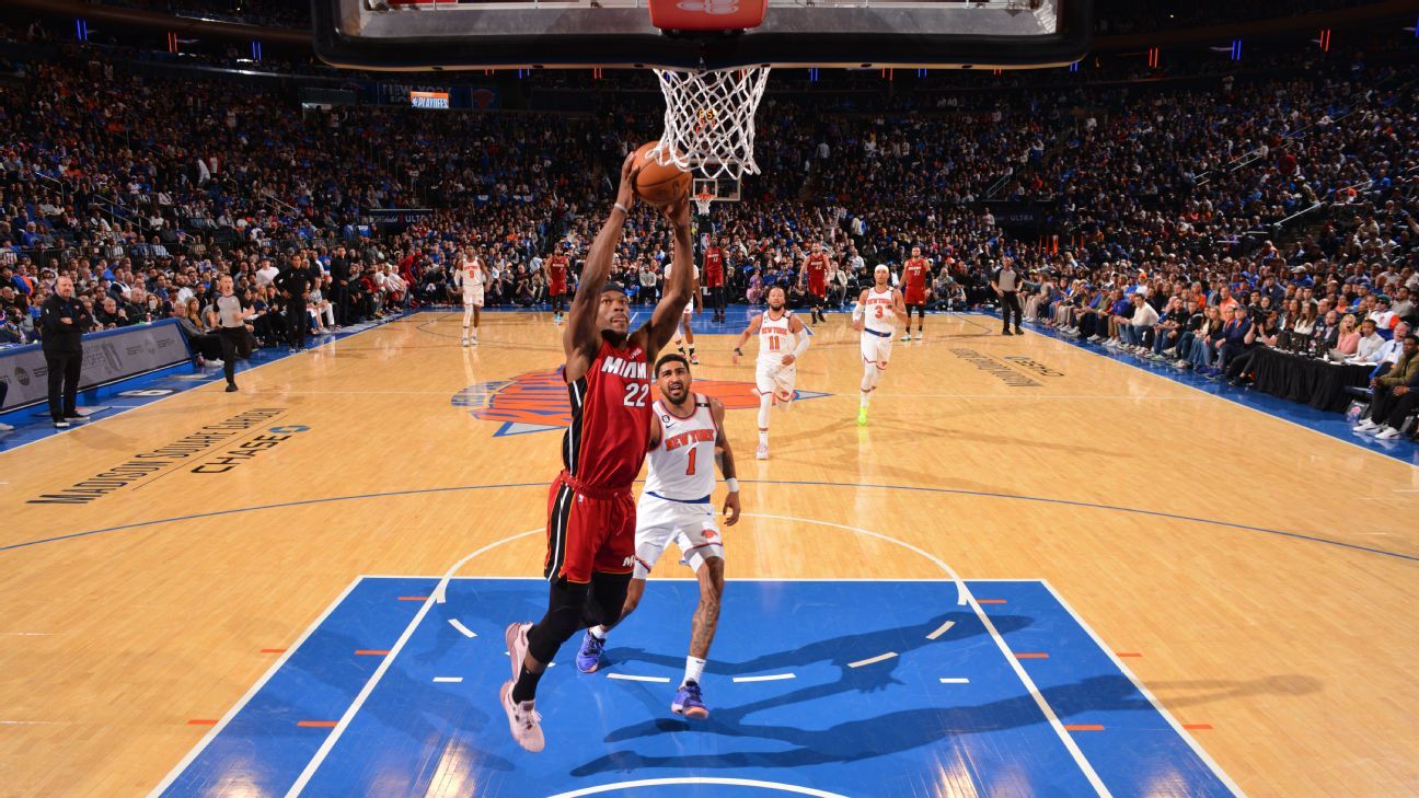Butler has the ball just above the 3-point line, just a few feet in front of famed director, and rabid Knicks fan, Spike Lee. Knicks swingman Josh Hart is draped around him.