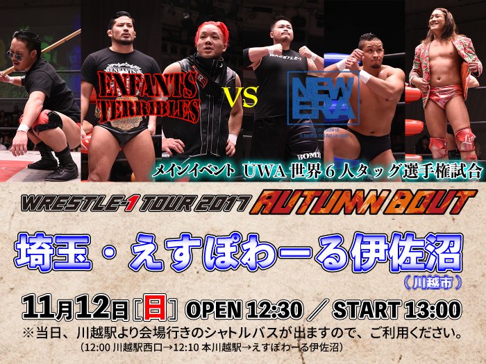 Kawagoe, en Saitama, fue la segunda escala de la gira “Wrestle-1 Tour 2017 Autumn Bout” donde se disputó un título. Previo a ellos, Yuji Hino se impuso en un mano a mano a Kumagoro. En el turno estelar se puso en juego el Campeonato UWA World Trios donde los monarcas reinantes Shotaro Ashino, Yusuke Kodama y Seigo …
