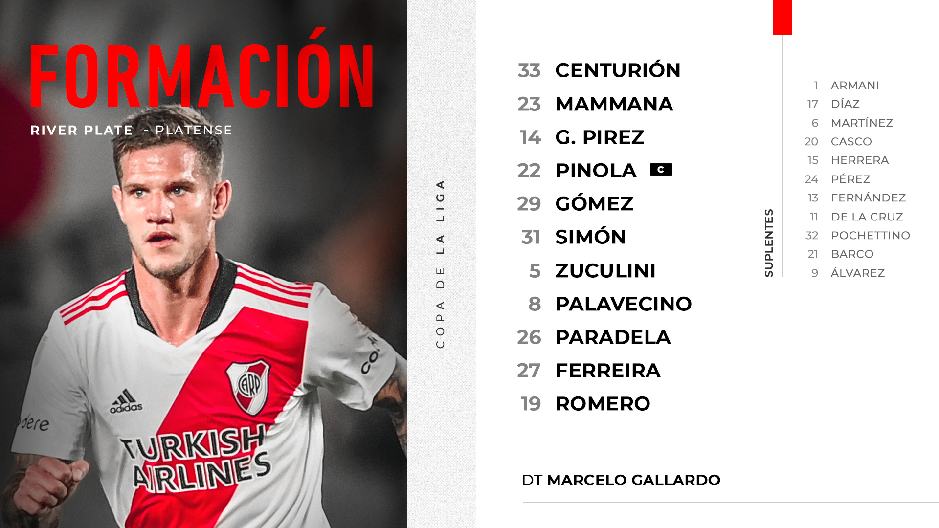 Posible alineación de River Plate: Franco Armani; Marcelo Herrera, Paulo Díaz, Héctor Martínez, Milton Casco; Enzo Pérez; Enzo Fernández, Nicolás de la Cruz, Santiago Simón; Matías Suárez y Julián Álvarez.