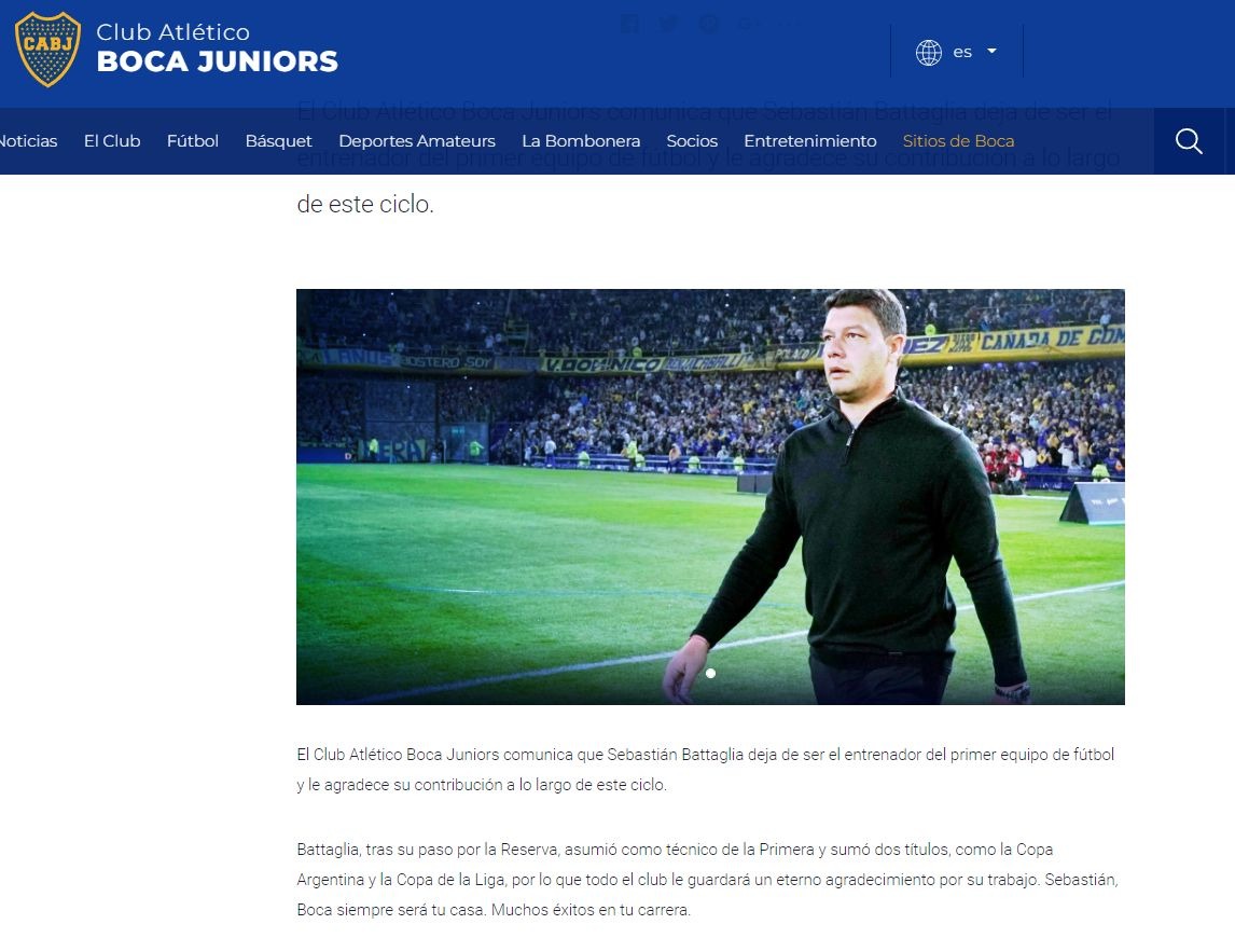 "El Club Atlético Boca Juniors comunica que Sebastián Battaglia deja de ser el entrenador del primer equipo de fútbol y le agradece su contribución a lo largo de este ciclo", expresó en sus redes sociales el club xeneize, tras la caída por penales (6-5) ante Corinthians el martes en partido de vuelta de octavos de final de la Libertadores jugado en La Bombonera.
