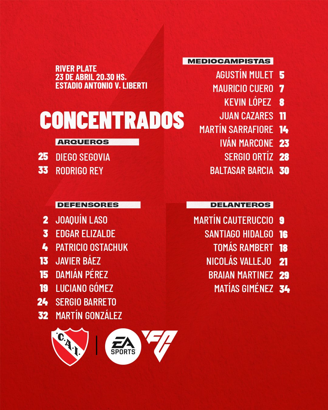 Los convocados para el partido de maana frente a Independiente en el Ms Monumental #VamosRiver pic.twitter.com/cVLqruXeJS