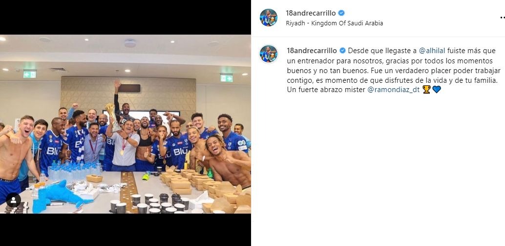 André Carrillo publicó en redes sociales una emotiva despedida para Ramón Díaz, entrenador argentino que decidió dejar la dirección técnica del Al-Hilal tras conquistar la Copa del Rey de Campeones de Arabia Saudita.