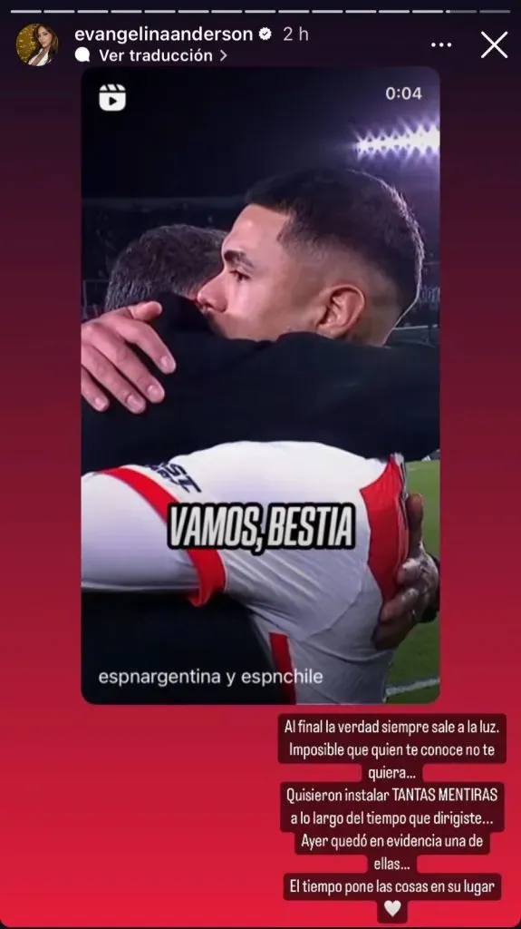 Sumado a todo esto, la esposa del ex DT del Millonario comentó que “al final la verdad siempre sale a la luz” y destacó la personalidad de Martín Demichelis: “Imposible que quien te conoce no te quiera”, escribió en la historia sin ningún tipo de tapujos por lo dicho en la semana pasada.