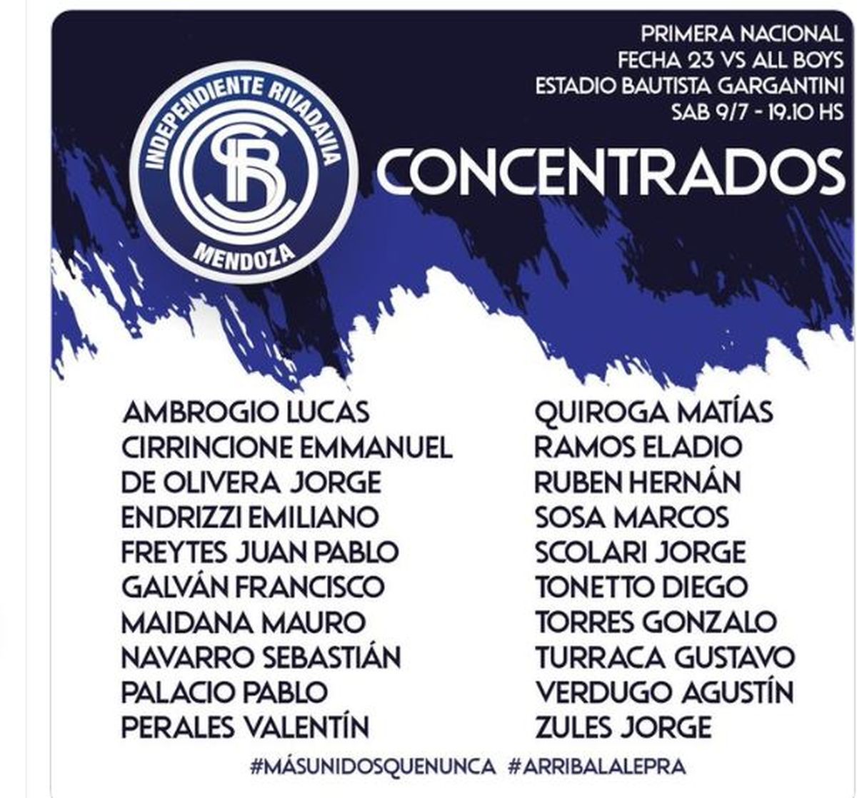 Independiente Rivadavia enfrentará este sábado desde las 19.10 a All Boys, en el estadio Bautista Gargantini, por la 23ª fecha del torneo de la Primera Nacional.