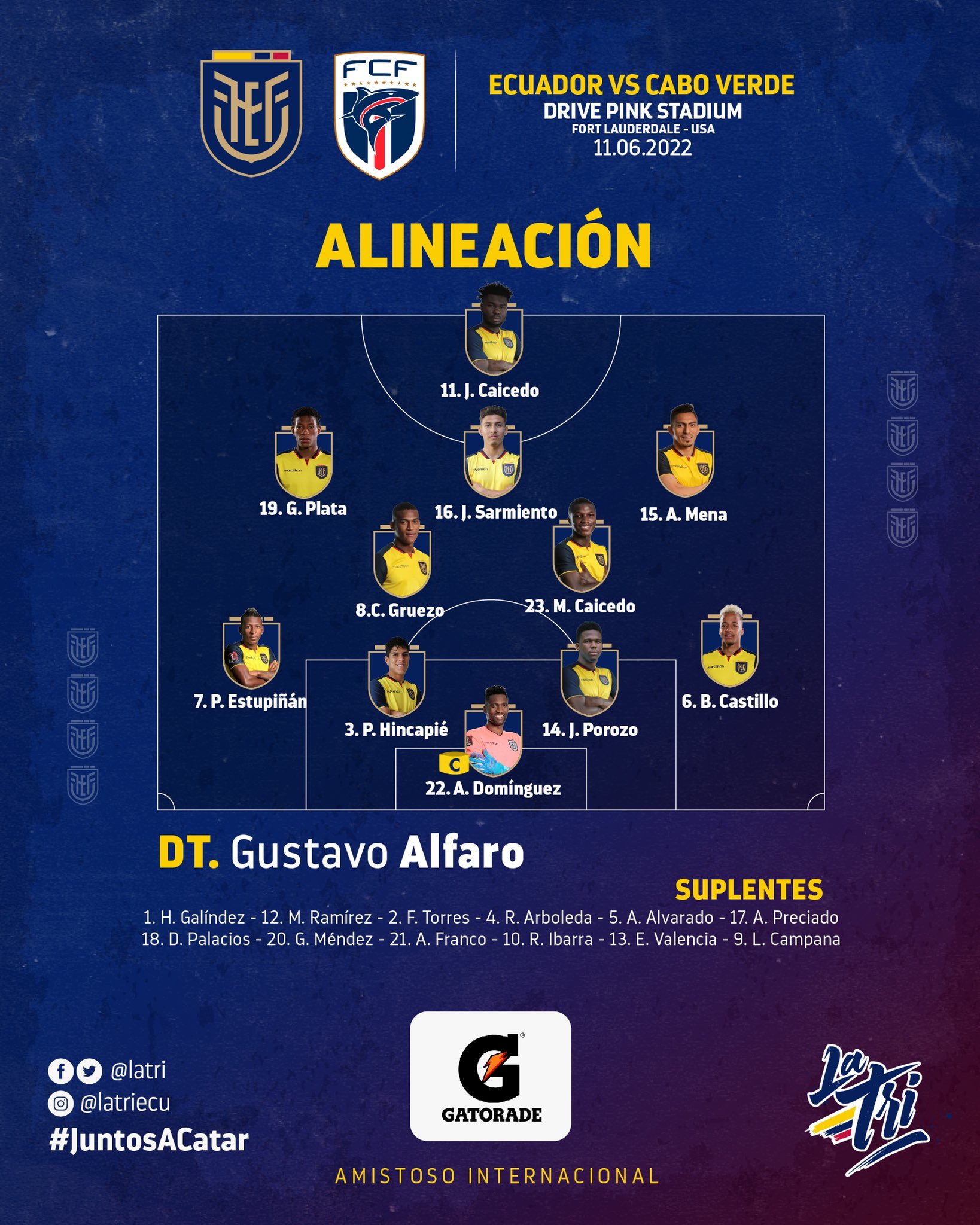 Ecuador: Alexander Domínguez – Byron Castillo, Piero Hincapié, Félix Torres, Pervis Estupiñán – Jeremy Sarmiento, Carlos Gruezo, Alan Franco, Gonzalo Plata – Leonardo Campana y Enner Valencia.