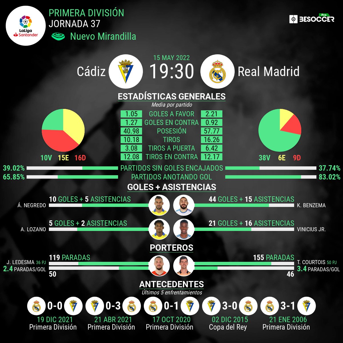 El duelo por la fecha 37 de LaLiga Santander entre Real Madrid y Cádiz se disputará este domingo 15 de mayo del 2022 en el estadio Nuevo Mirandilla.