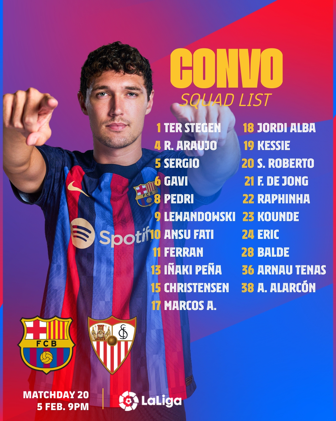 Conoce a los convocados de Xavi para el encuentro ante Sevilla.