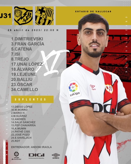 Rayo Vallecano: Dimitrevski, Baillu, Lejeune, Mumin, Fran García, Comesaña, Valentín, Isi, Trejo, Martín RDT.