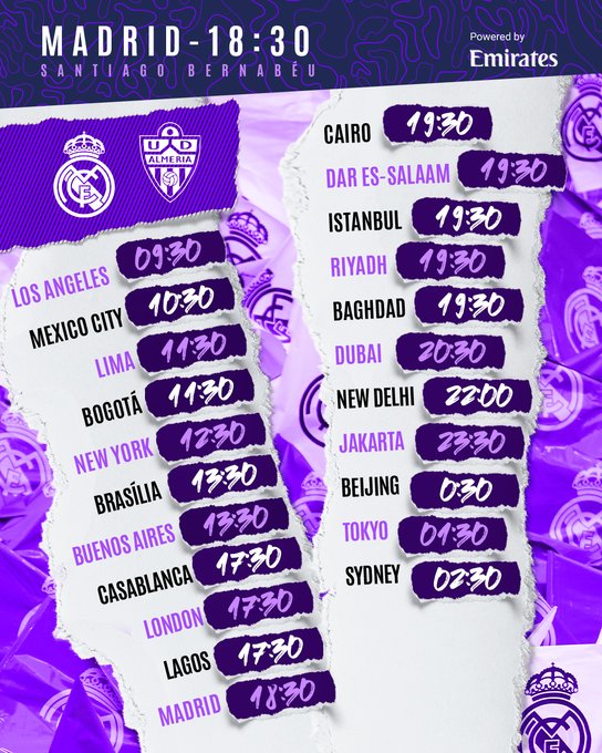 El conjunto madridista jugará este sábado 29 de abril por la jornada 32 de LaLiga Santander contra Almería. Este encuentro se llevará a cabo en el estadio Santiago Bernabéu, ubicado en la ciudad de Madrid. Aquí el horario del partido por países: