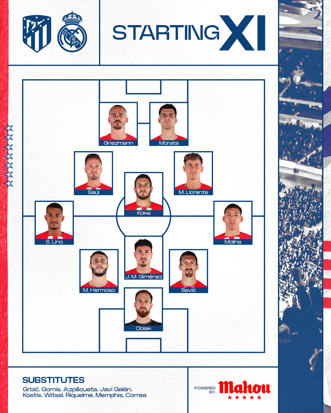 Jan Oblak; Nahuel Molina, Stefan Savic, José María Giménez, Mario Hermoso, Samuel Lino; Marcos Llorente, Koke, Saúl; Antoine Griezmann, Álvaro Morata o Memphis Depay.