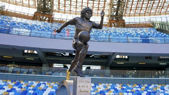 Diego Maradona: No hay premios en juego para adivinar quién tiene la única estatua a la vista en el Stadio Diego Armando Maradona. Nápoles develó la estatua de bronce el 28 de noviembre de 2021, un año después del fallecimiento del ícono argentino. Según el escultor nacido en Nápoles Dario Caruso, Stefano Ceci, exentrenador y amigo de Maradona, le había prometido una estatua para honrarlo después de que le otorgaran la ciudadanía honoraria de la ciudad en 2017. Ceci ya tenía un escaneo del pie de Maradona, que se reproduce en oro en la estatua. Esta escultura está ubicada dentro del estadio, cerca de los vestuarios.