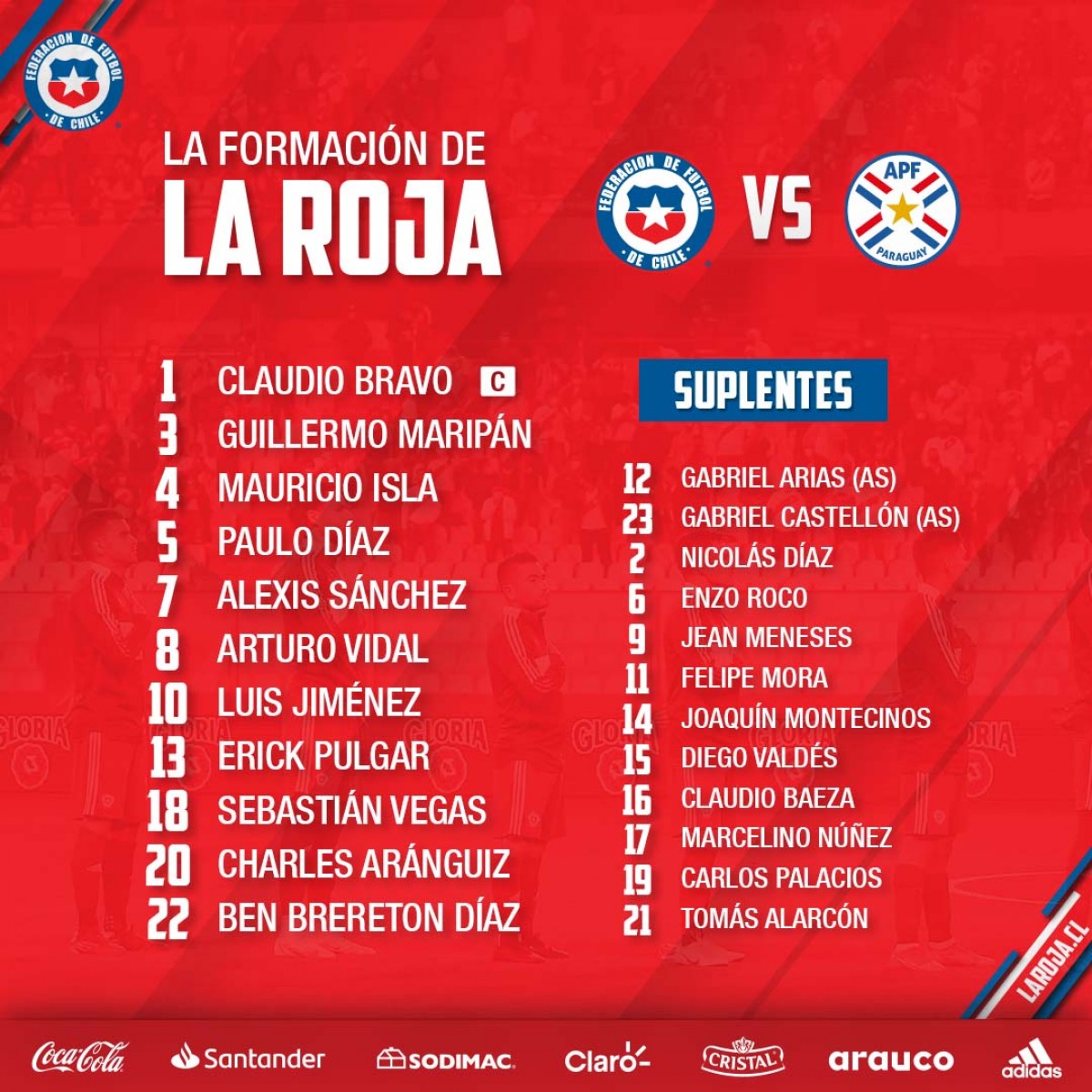 Chile: Claudio Bravo, Mauricio Isla, Paulo Díaz, Guillermo Maripán, Sebastián Vegas; Erick Pulgar, Charles Aránguiz, Arturo Vidal; Alexis Sánchez, Benjamin Brereton, Felipe Mora.