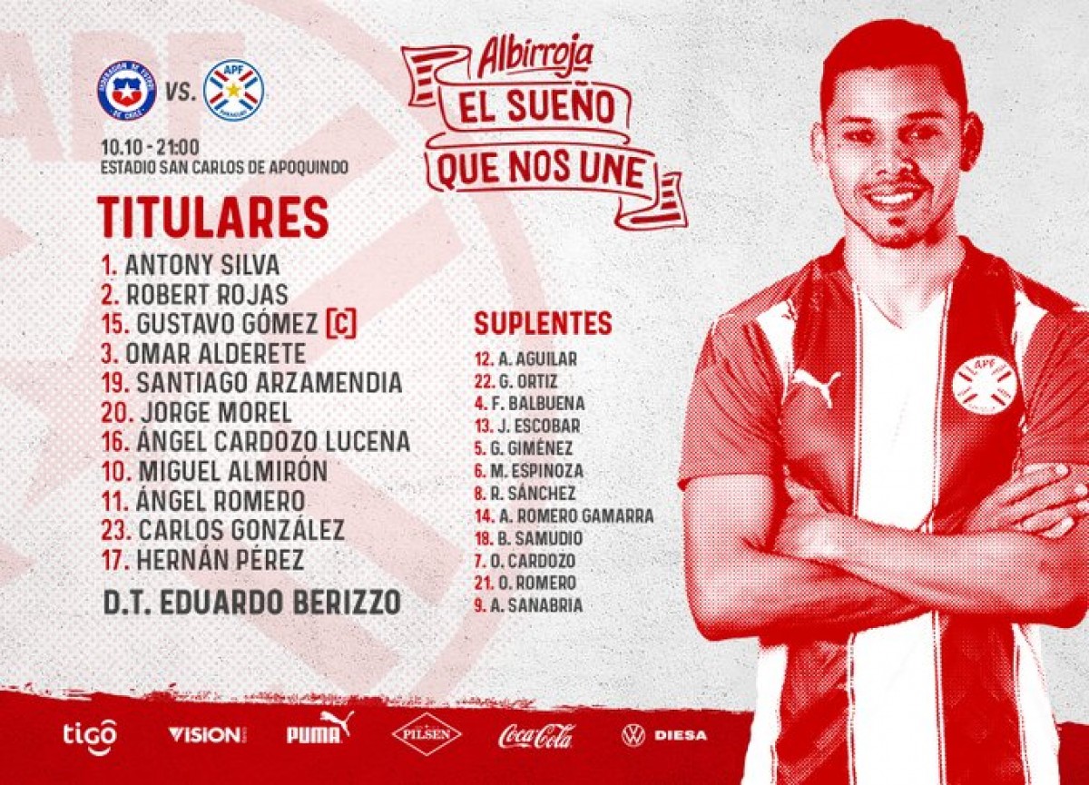 La 'Albirroja' confirmó a s equipo que se medirá en Santiago ante Chile: Anthony Silva; Robert Rojas, Gustavo Gómez, Omar Alderete, Santiago Arazmendia; Jorge Morel, Ángel Cardozo, Richard Sánchez, Miguel Almirón; Ángel Romero, Carlos González, Hernán Pérez.