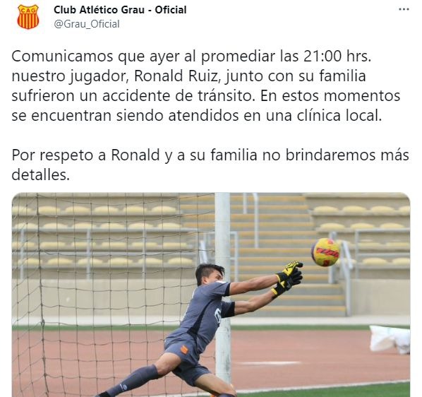 "Comunicamos que ayer al promediar las 21:00 hrs. nuestro jugador, Ronald Ruiz, junto con su familia sufrieron un accidente de tránsito. En estos momentos se encuentran siendo atendidos en una clínica local. Por respeto a Ronald y a su familia no brindaremos más detalles. Pedimos a todos por favor, elevar una oración por la salud de Ronald y de su familia en este momento tan complicado. ¡Estamos contigo 'Banana'!", dice el mensaje del club piurano.