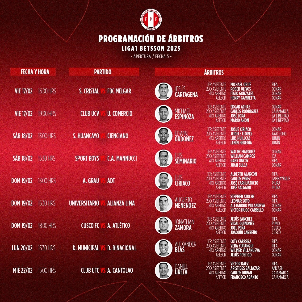 La Comisión Nacional de Árbitros (Conar) publicó la lista de jueces que dirigirán los partidos de la quinta jornada del Torneo Apertura de la Liga 1 - 2023.
