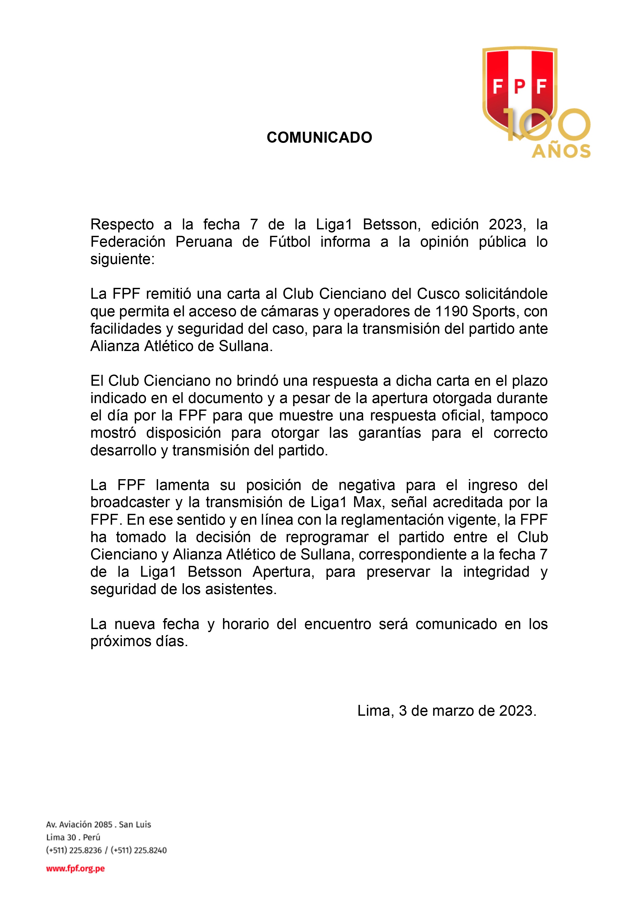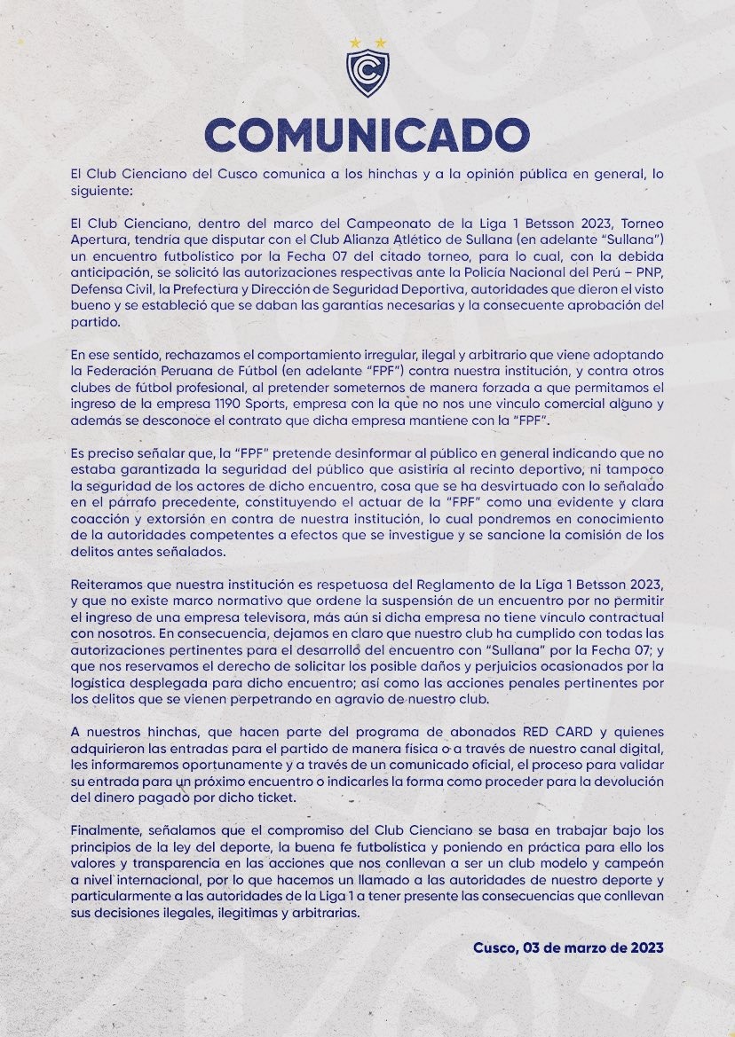 "Regarding matchday 7 of the 2023 Liga 1 edition, the Peruvian Football Federation informs the general public as follows: The FPF sent a letter to Club Cienciano del Cusco requesting that they allow the access of cameras and operators from 1190 Sports, with the necessary facilities and security, for the transmission of the match against Alianza Atlético de Sullana," the statement said.