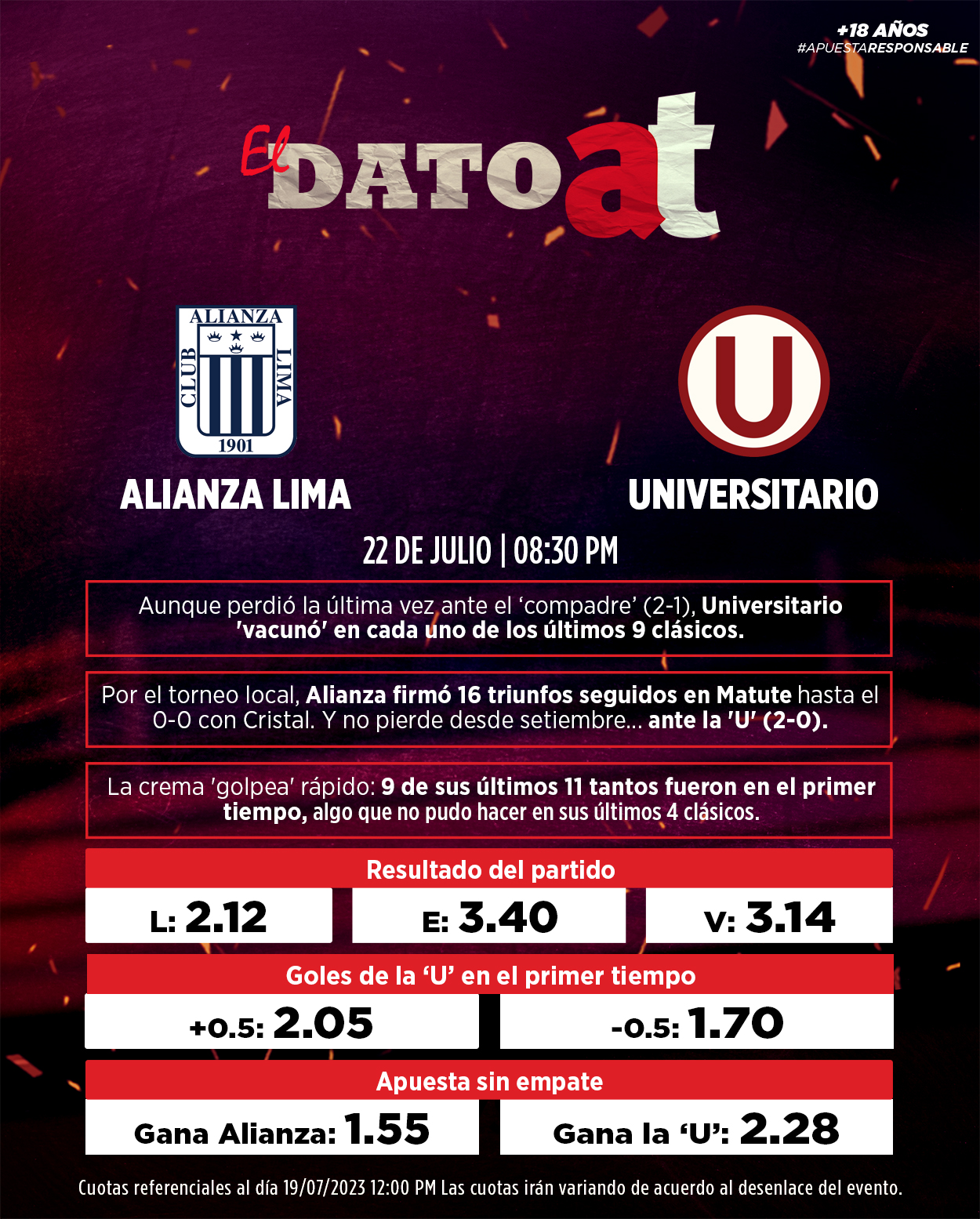 De acuerdo con Betsson, Alianza Lima es favorito con un 46% de probabilidades de ganar el partido, pagando una cuota de 2.02. Mientras tanto, a Universitario de Deportes le asigna un 28% de probabilidades llevarse el triunfo en Matute, pagando 3.35 veces lo apostado. En lo que respecta al empate, tiene un 26% de probabilidad y paga 3.35.