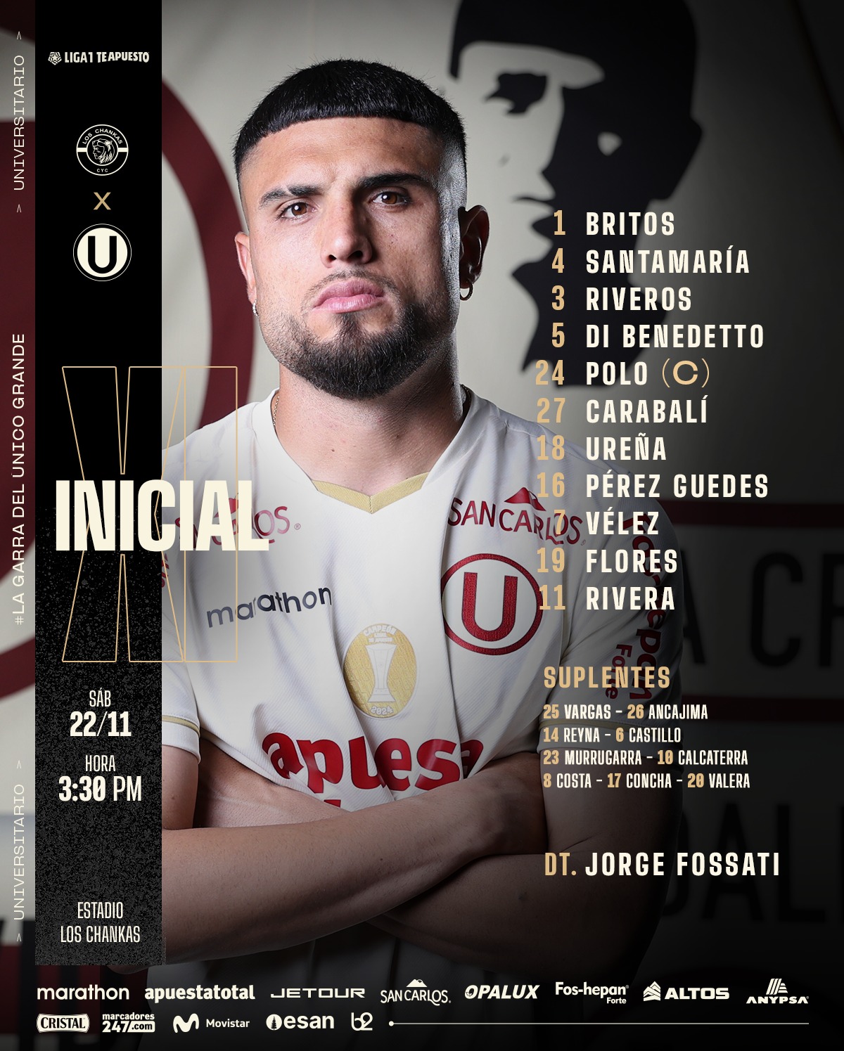 Universitario de Deportes se prepara para enfrentar a Los Chankas este sábado 22 de noviembre en un partido decisivo correspondiente a la fecha 19 del Torneo Clausura de la Liga 1 2025. El encuentro tendrá lugar en el estadio Los Chankas, en Andahuaylas, en lo que representa uno de los retos más exigentes para el tricampeón nacional.