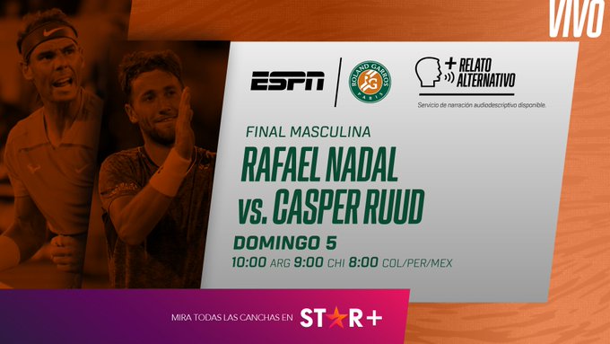 El partido entre Rafael Nadal y Casper Ruud por la final del Roland Garros será transmitido por las señales de ESPN y STAR+ para todo Latinoamérica, mientras que para España, la señal habilitada para emitir el partido es la de DAZN. También, podrás seguir el minuto a minuto en la web de DT El Comercio.