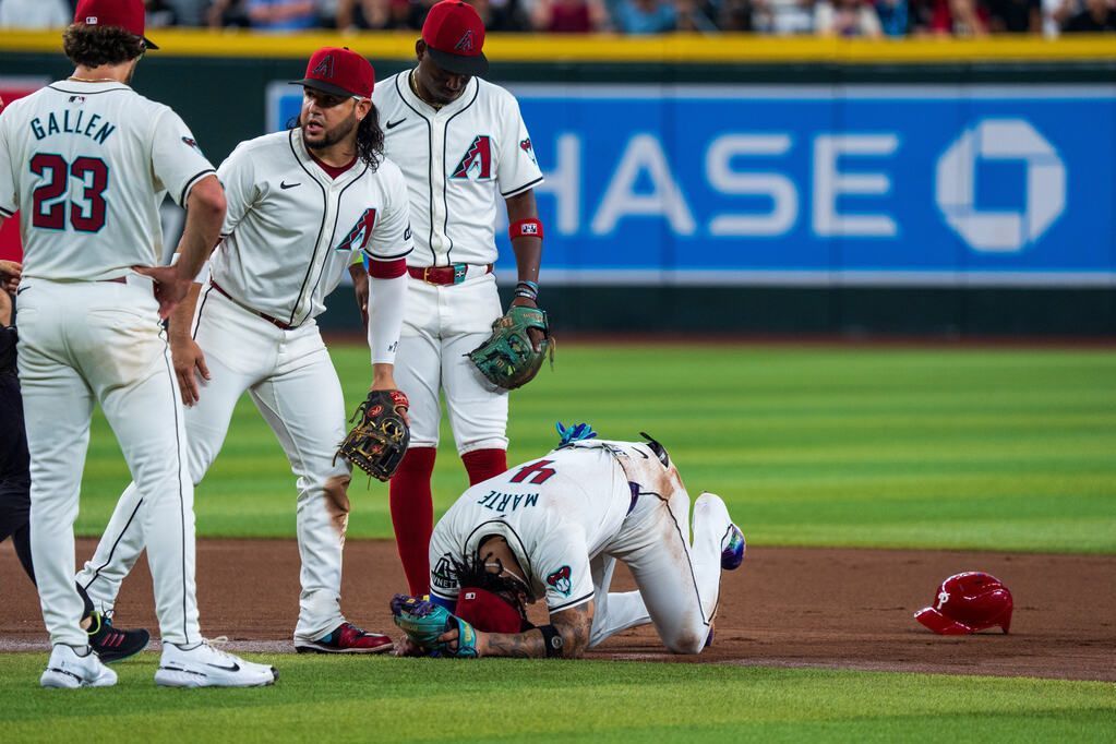 In the fourth inning, with Arizona leading 2-0, Philadelphia catcher Garrett Stubbs lined a hit off third baseman Eugenio Suárez's glove and stretched it into a double. The throw to Marte covering second was late and Stubbs' head-first slide landed him on the back of Marte's left leg as the fielder was on his knee, and he fell to the ground in pain. He eventually left the field under his own power with a trainer and was replaced by Kevin Newman.