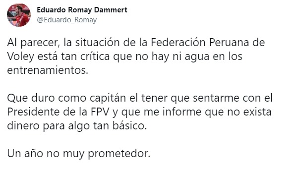 "Al parecer, la situación de la Federación Peruana de Vóley está tan crítica que no hay ni agua en los entrenamientos", empieza señalando el jugador en un mensaje publicado en su cuenta de Twitter.